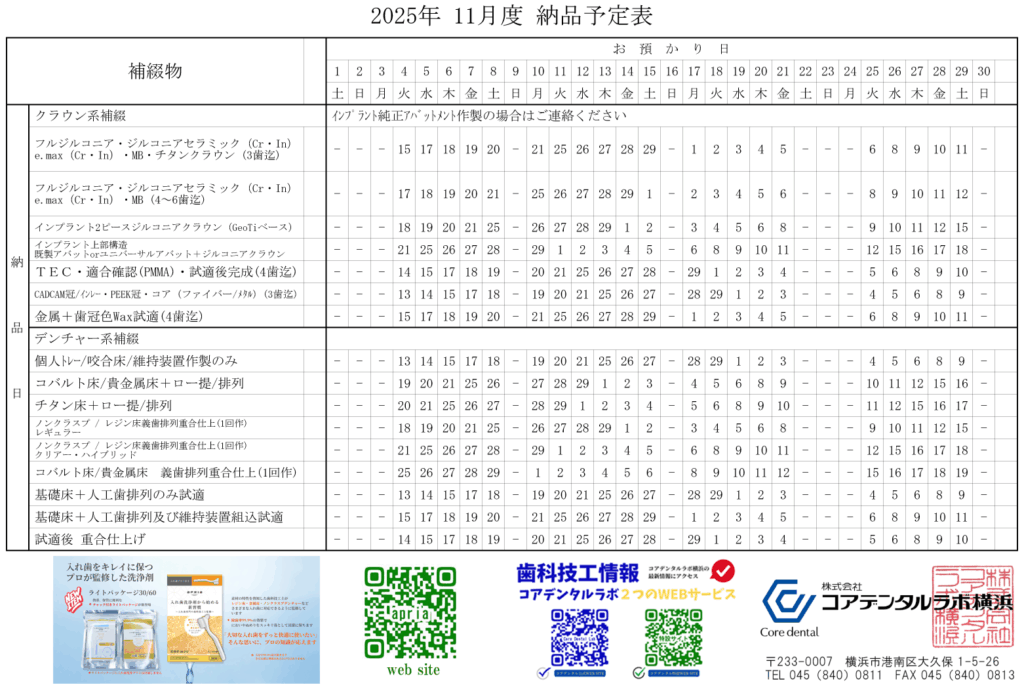 Topics トピックス 2025.10.20 【2025年11月】技工納期表のお知らせ 2025年11月技工納品予定表を公開しました お届け日の確認は、特設サイト技工納品予定及び専用アプリでご確認いただけます ご活用をよろしくお願いいたします(クリックで特設サイト技工納期表が開きます) SNS instagram X でもご案内しています。フォローをお願いいたします 一覧に戻る