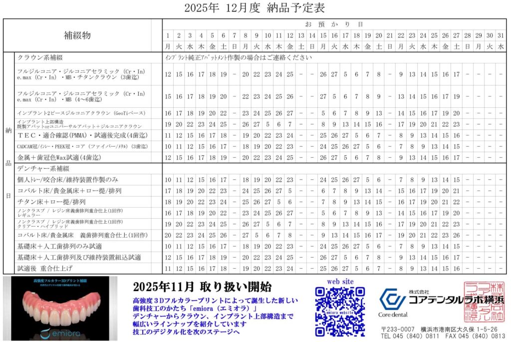 Topics トピックス 2025.11.11 【2025年12月】技工納期表のお知らせ 2025年12月技工納品予定表を公開しました お届け日の確認は、特設サイト技工納品予定及び専用アプリでご確認いただけます ご活用をよろしくお願いいたします(クリックで特設サイト技工納期表が開きます) SNSで技工に関する様々な情報を発信して言います instagram X 宜しければフォローをお願いいたします 一覧に戻る