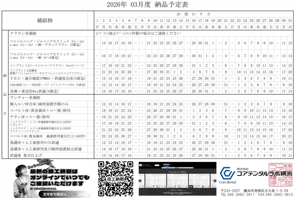 【2026年3月】技工納期表のお知らせ